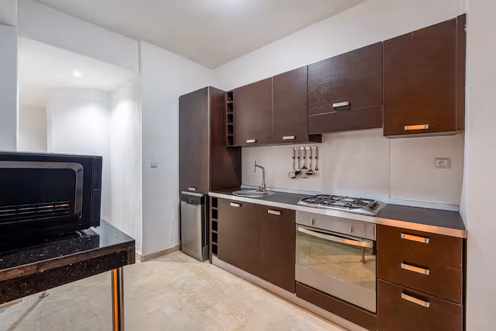 Découvrez un appartement moderne situé au rez-de-chaussée, idéal pour les familles, les couples ou les voyageurs d’affaires. Il offre un salon lumineux avec une décoration élégante, une cuisine entièrement équipée, deux chambres confortables, un balcon privé et l’accès à la piscine de la résidence.